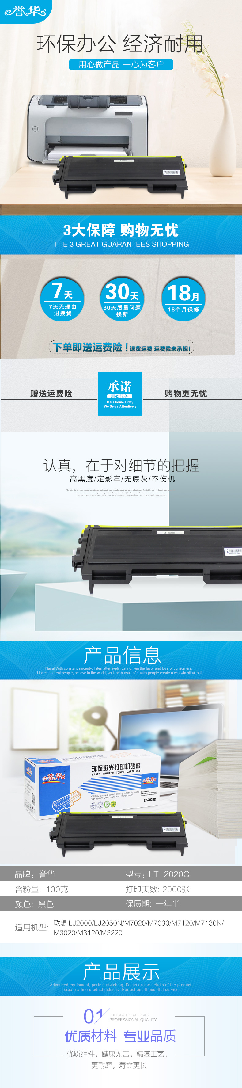 誉华打印机硒鼓LT-2020C适用联想 LJ2000/LJ2050N/M7020等 黑色 黑色 自营
