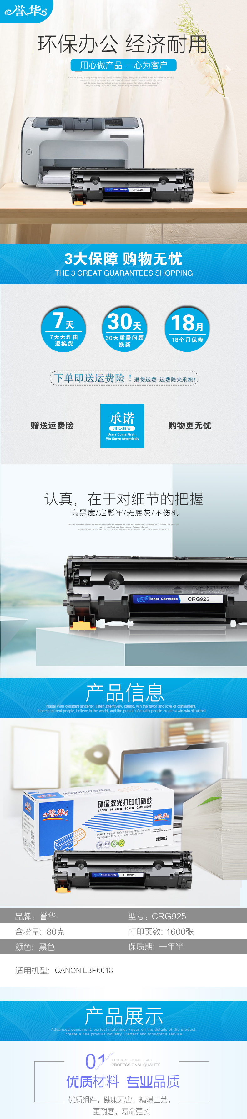 誉华CRG925打印机硒鼓黑色单只打印1600页适用CANON LBP6018等 黑色 自营
