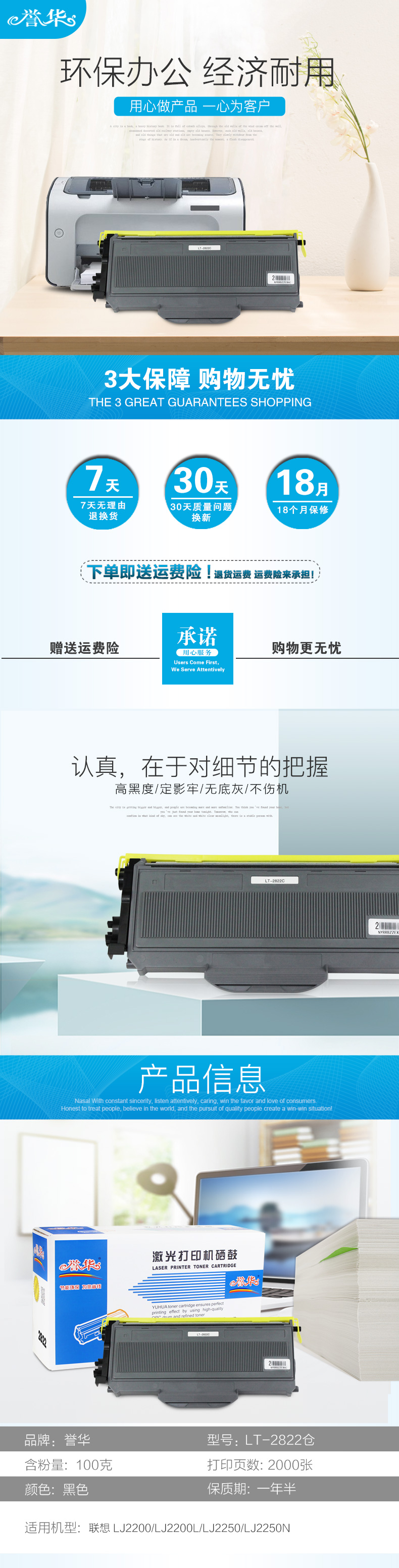 誉华LT2822打印机粉仓黑色适用联想 LJ2200/LJ2200L/LJ2250等 黑色 自营