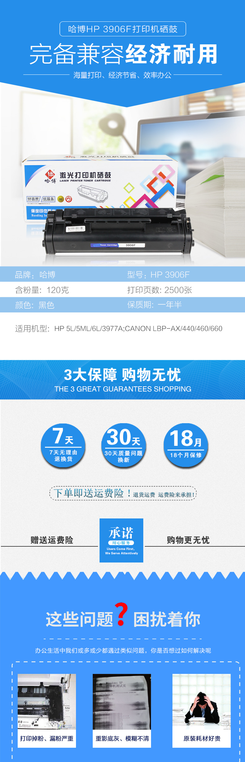 哈博HP 3906F硒鼓黑色适用HP 5L/5ML/6L/3977A等打印机 黑色 自营