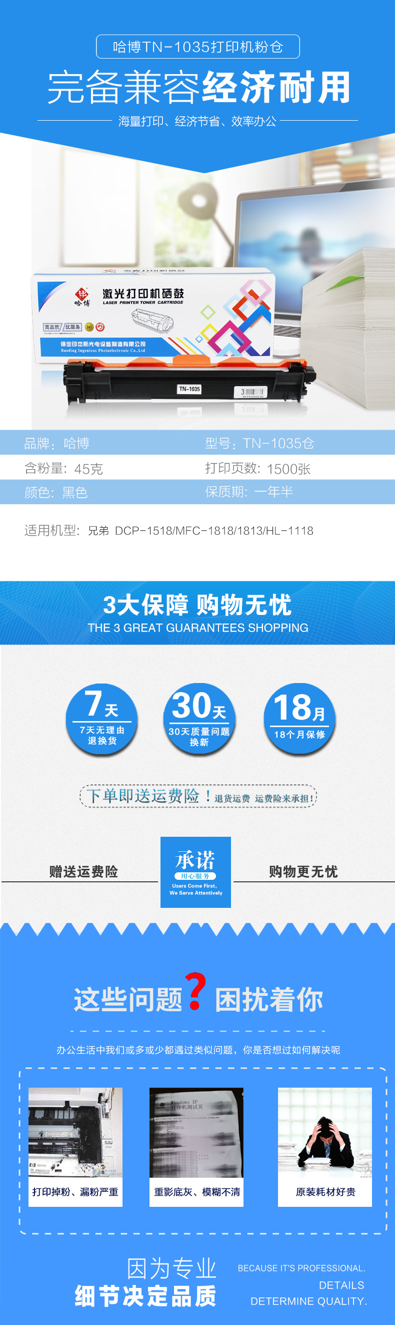 哈博TN1035粉仓 适用兄弟DCP-1518/MFC-1818/1813/HL-1118 黑色 自营