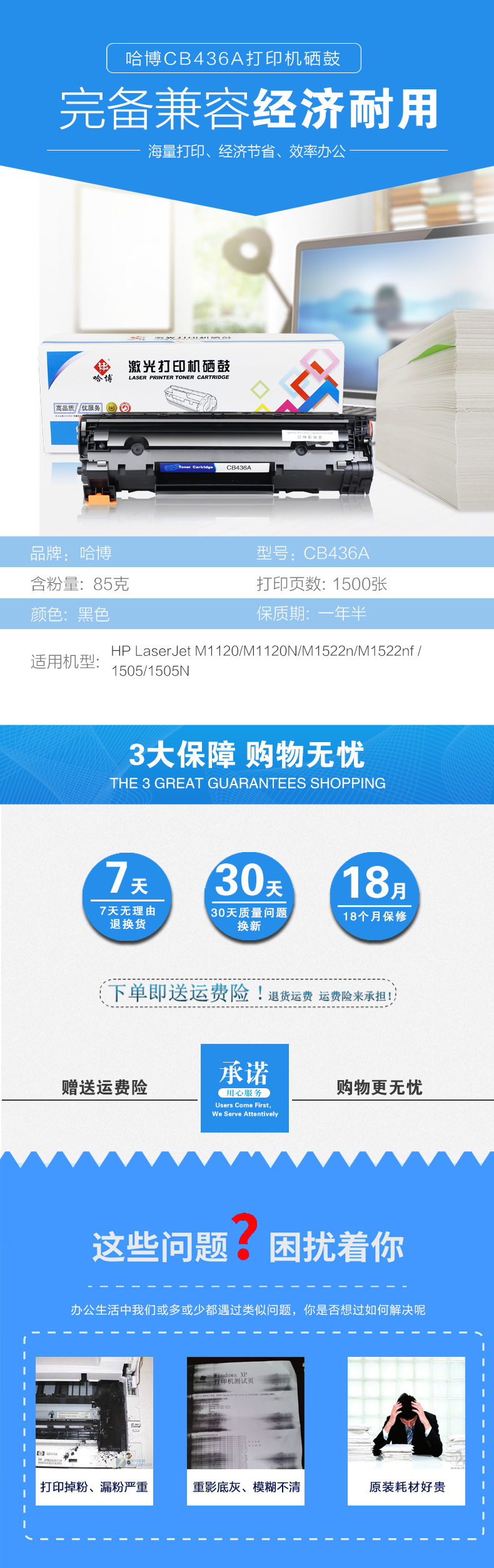 哈博CB436A易加粉打印机硒鼓适用M1120/M1120N/M1522n/ 等 黑色 自营