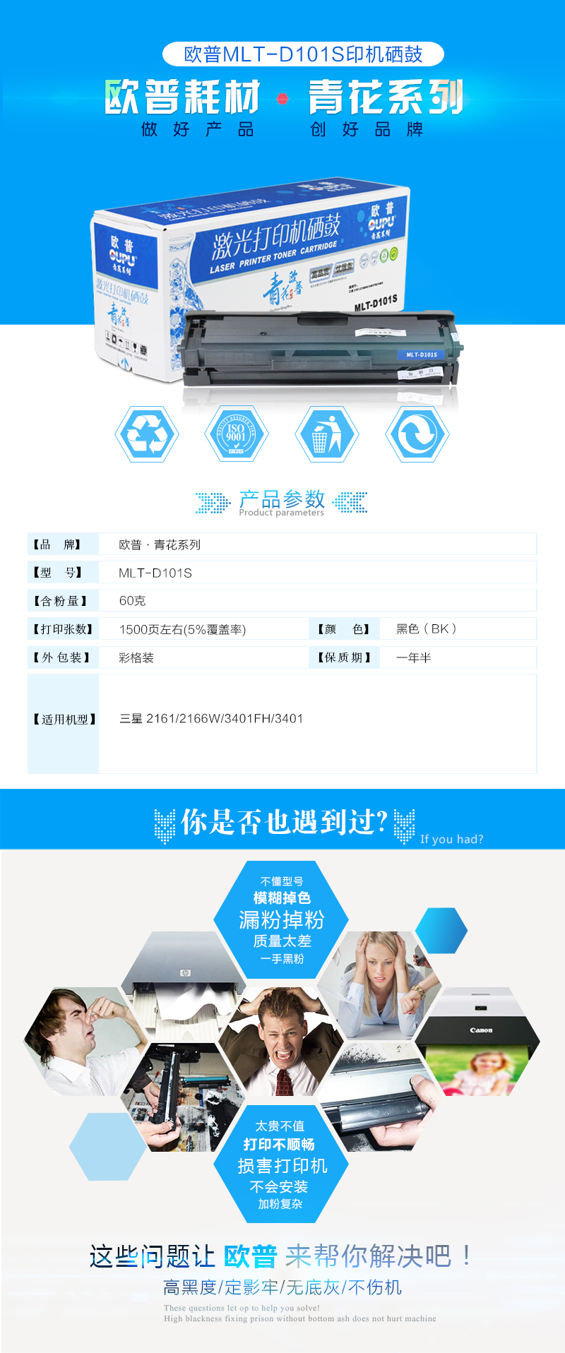 欧普(oupu)青花系列MLT-101S易加粉硒鼓适用三星 2161/2166W/3401FH/3401等 自营