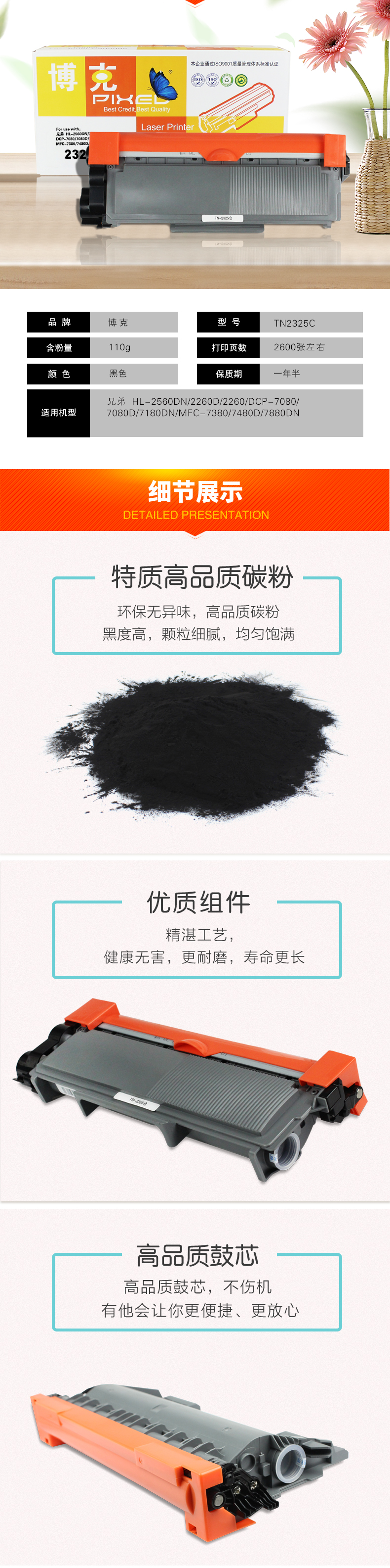 博克(PIXEL)打印机粉仓TN-2325适用兄弟HL-2560DN/2260/DCP-7080等 黑色 自营