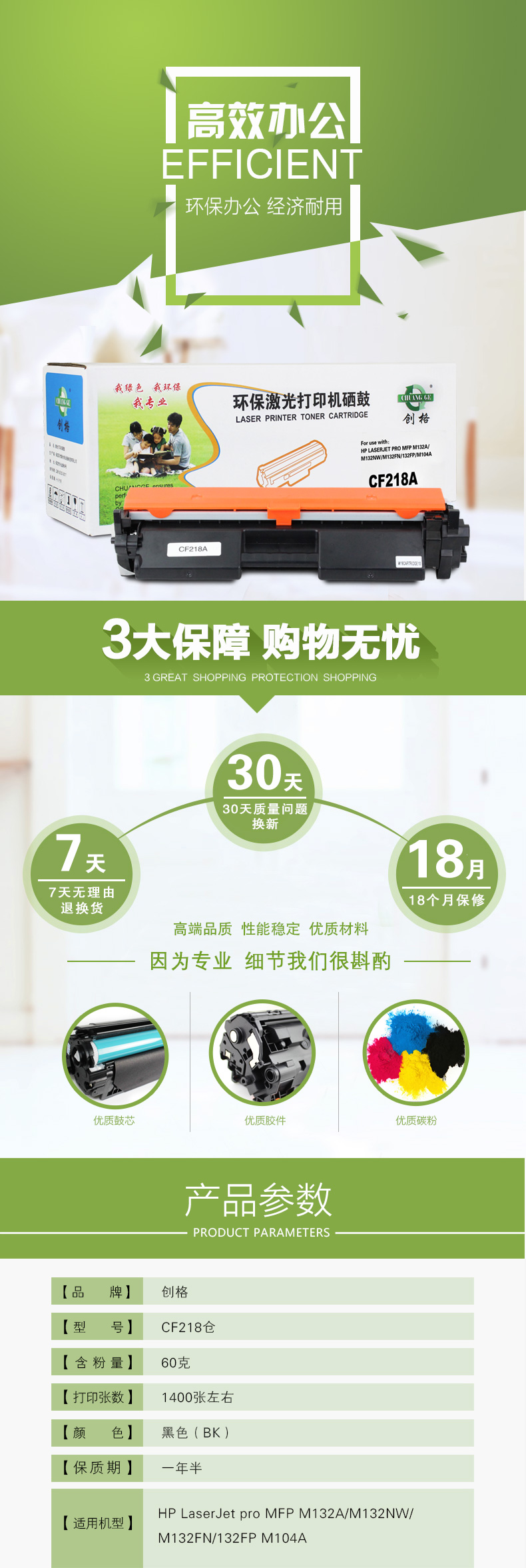 创格(CHUANG GE)CF218A打印机硒鼓适用HP LaserJet pro MFP M132等 黑色 黑色 自营