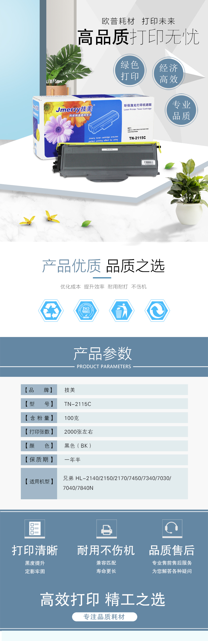 技美(Jmerry)TN-2115粉仓适用兄弟 HL-2140/2150/2170/7450/7340等 黑色 自营