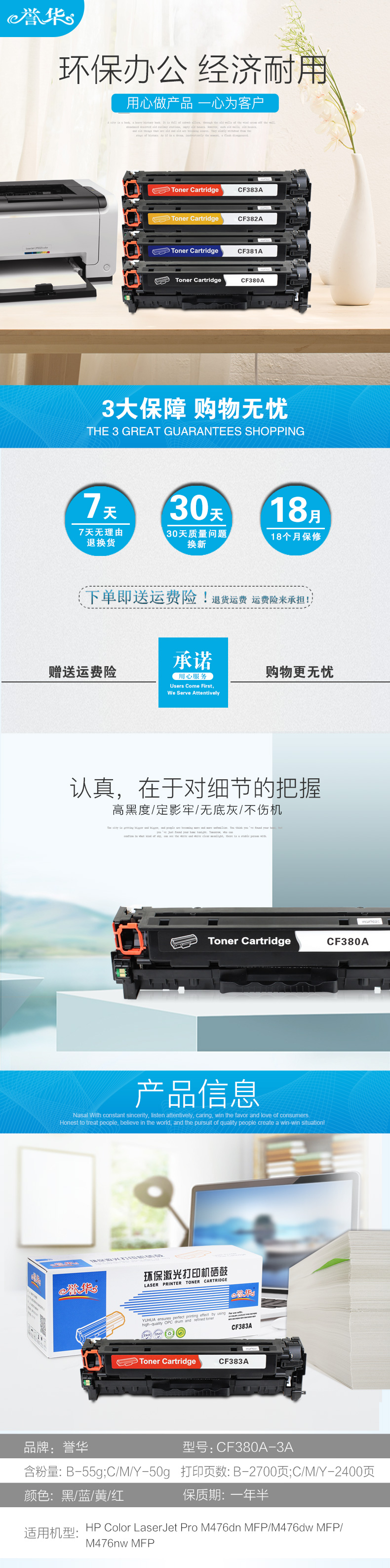 誉华彩色硒鼓CF380-3A适用HP M476dn MFP/M476dw/M476nw等 蓝色 自营