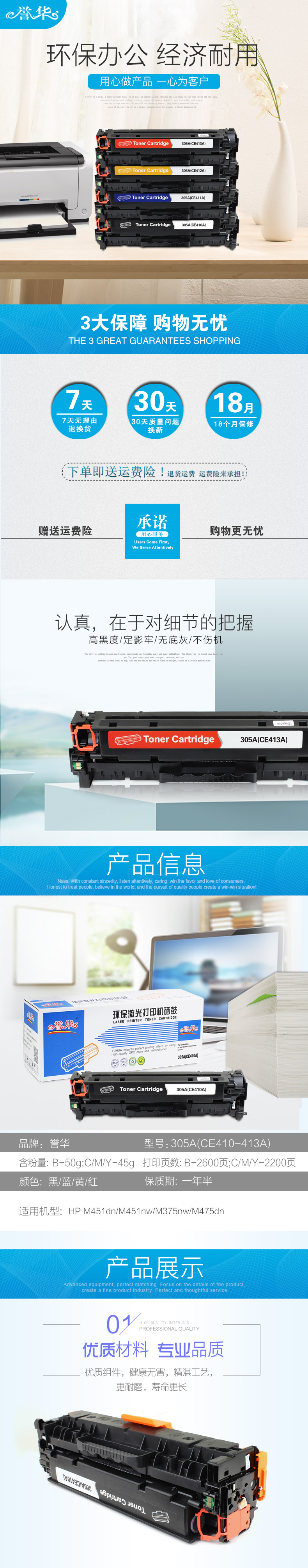 誉华彩色硒鼓305A(CE410-413A)适用于HP M451dn/M451nw/M375nw等 黄色 自营