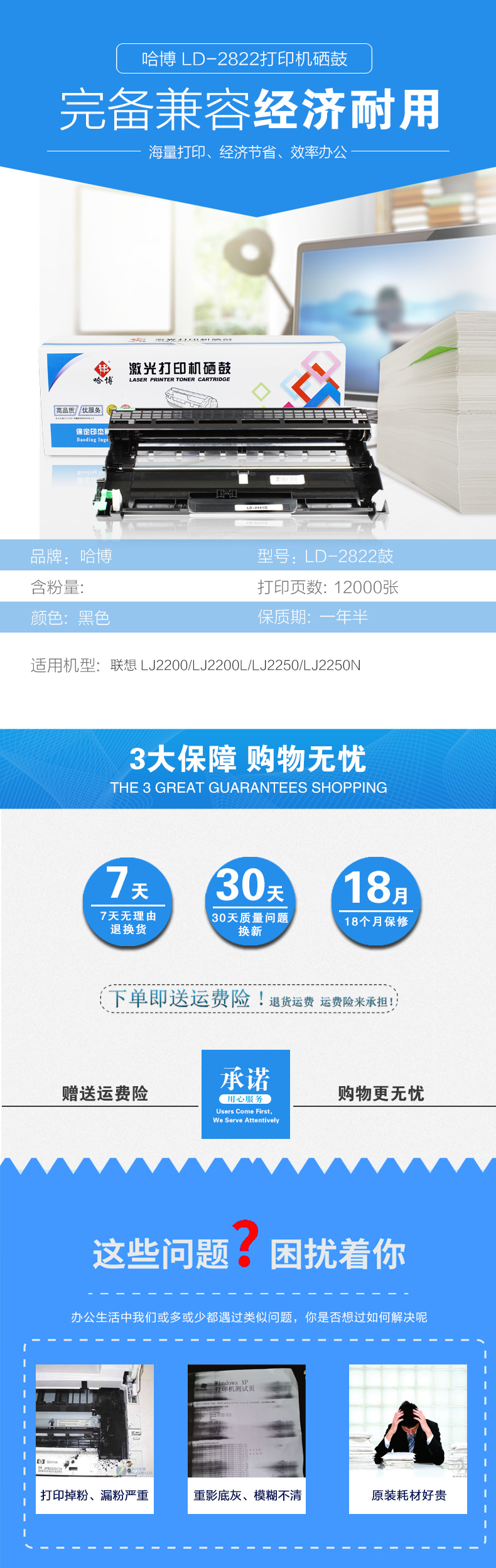 哈博LD2822打印机硒鼓单只装适用联想 LJ2200/LJ2200L/LJ2250等 黑色 自营