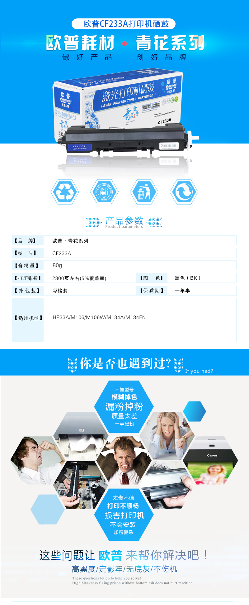 欧普(oupu)青花系列CF233粉仓 适用HP33A/M106/M106W/M134A/M134FN 自营
