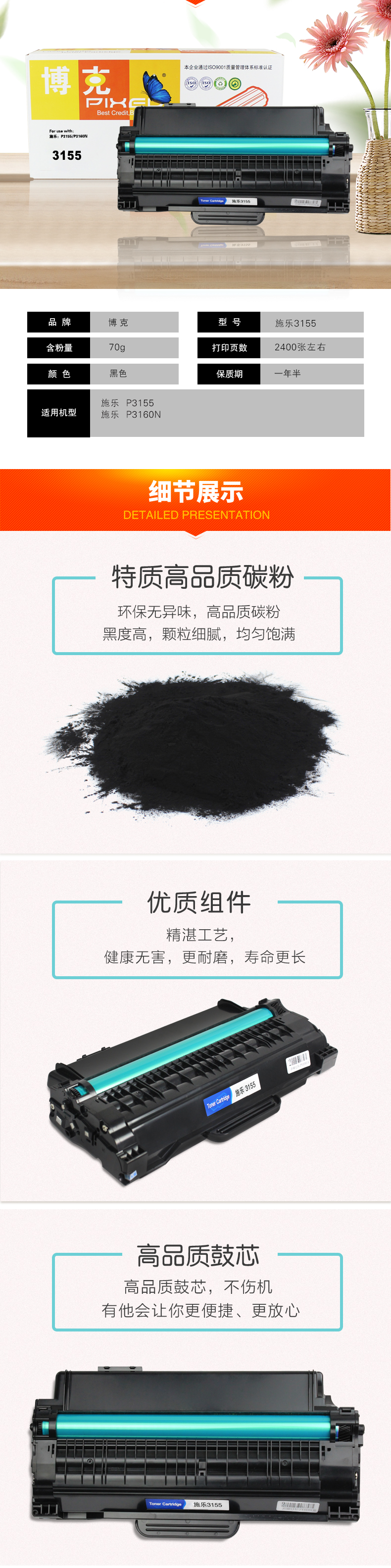 博克(PIXEL)施乐3155打印机耗材单只黑色硒鼓适用施乐 P3155/P3160N 黑色 自营