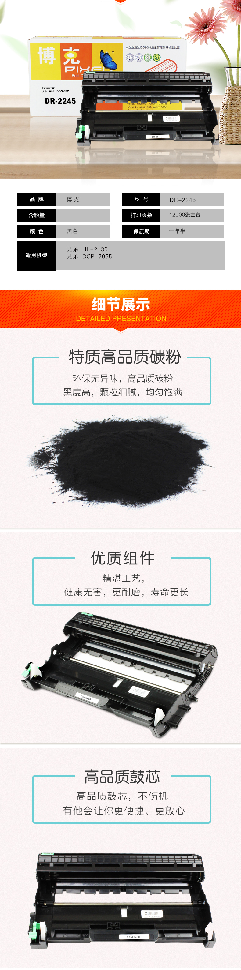 博克(PIXEL)打印机硒鼓DR2245适用兄弟 HL-2130/DCP-7055耗材 黑色 自营